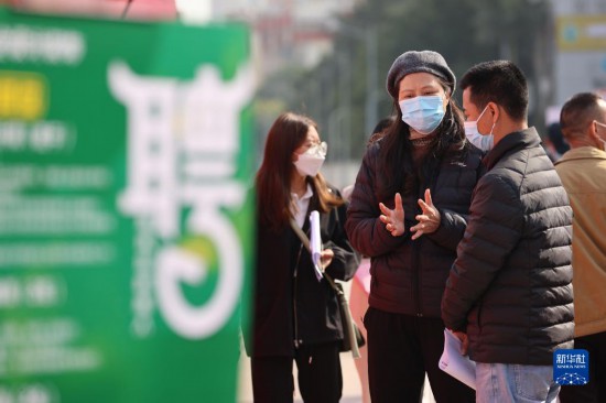 2月26日,招聘人員(左二)與求職者交流崗位信息。