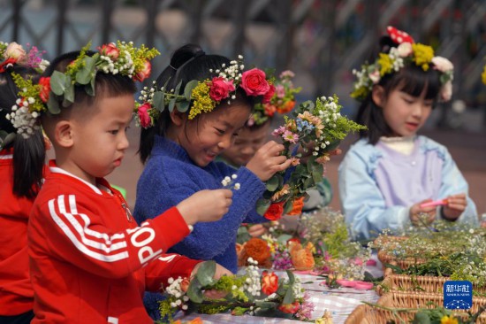 當日,重慶市北碚區縉云幼兒園開展“編花環 迎春天”手工制作活動,孩子們在老師的指導下,用枝條和鮮花編制成一頂頂多彩花環,感受春天的氣息,喜迎春天的到來。