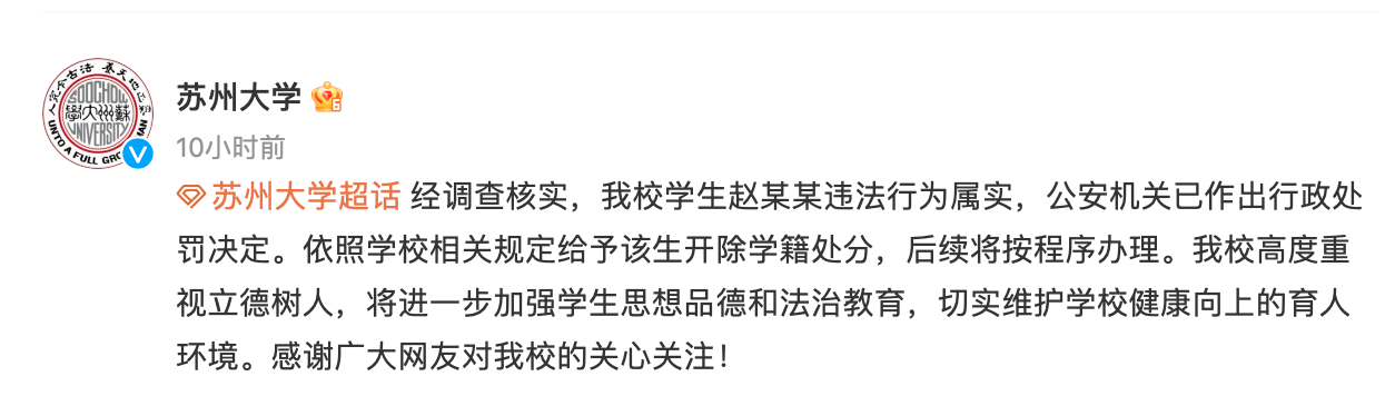 蘇州大學在回應中表示,學校高度重視立德樹人,將進一步加強學生思想品德和法治教育,切實維護學校健康向上的育人環境。