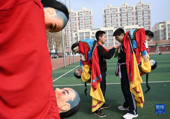 3月20日,隆化縣職教中心學生在練習國家級非遺項目“二貴摔跤”前互相整理衣物。