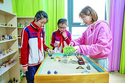 浙江省寧波市江北區洪塘實驗學校的心理教師在心理輔導室和學生一起擺放沙盤。新華社發