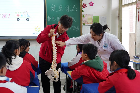 志愿者們給哪嗙小學帶去了一個脊柱模型?破諘r,丁禹承把這個模型放在講臺上,通過調整活動的脊椎,向孩子們展示正常的脊柱和出現脊柱側彎問題的脊柱。