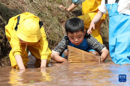 4月10日,四川省廣安市武勝縣東方紅幼兒園的小朋友在龍女鎮的稻田里抓魚。