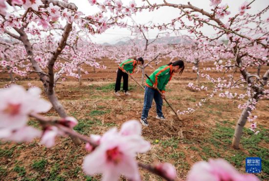 4月10日,河北省遵化市東舊寨鎮梁屯中心小學的學生在桃樹果園體驗鋤草勞動。