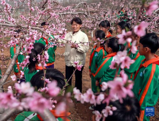 4月10日,技術人員在桃樹果園向河北省遵化市東舊寨鎮梁屯中心小學的學生介紹桃樹生長知識。