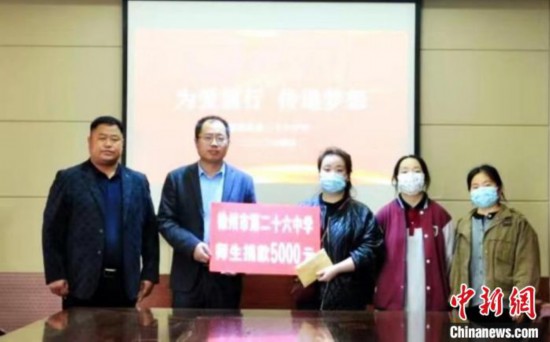 徐州市第二十六中學為付明子家里送去5000元愛心捐款!⌒熘菔泄臉菂^委宣傳部供圖