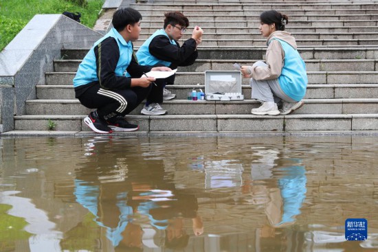 4月29日,在衡陽縣西渡鎮新橋村,南華大學的大學生志愿者在檢測水質。