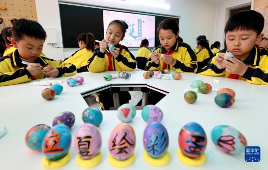 5月5日,在山東省棗莊市東湖小學,學生們在繪制彩蛋。