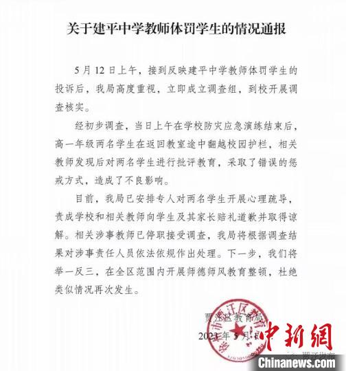 通報稱,接到反映建平中學教師體罰學生的投訴后,該局高度重視,立即成立調查組,到校開展調查核實。