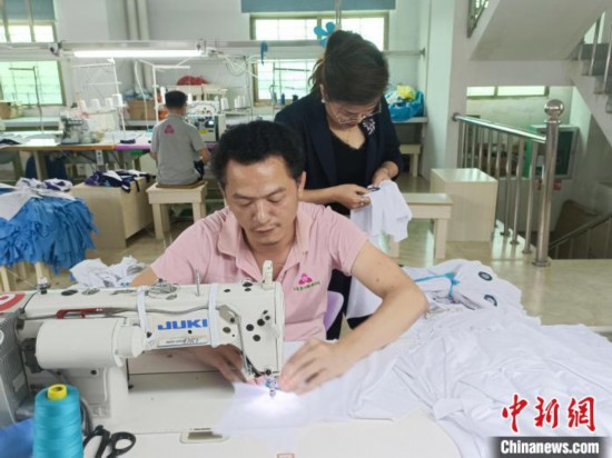 “剛回海南創業時只有毛坯房,現在的工廠和辦公區有四層樓,都是一點一點干出來的!痹诤D贤趸◥坌姆椨邢薰镜纳a車間,總經理李王花時而指導員工改進服裝縫紉細節,時而與殘疾員工互道“加油”,車間里常常響起她爽朗的笑聲。