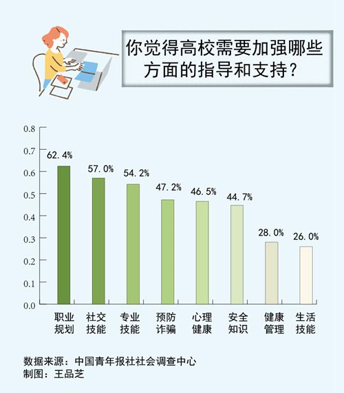 調查中,大家希望高校加強職業規劃培訓(62.4%)、社交技能培訓(57.0%)、專業技能培訓(54.2%)等方面的指導和支持。接下來還有:預防詐騙培訓(47.2%)、心理健康輔導(46.5%)、安全知識培訓(44.7%)、健康管理知識培訓(28.0%)、生活技能培訓(26.0%)等。