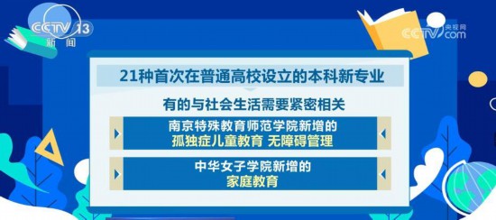 21種首次在普通高校設立的本科新專業,有的與社會生活需要緊密相關,比如南京特殊教育師范學院新增的孤獨癥兒童教育、無障礙管理,中華女子學院新增的家庭教育;有的與城鄉建設緊密相關,比如海南大學新增的鄉村治理,北京林業大學新增的國家公園建設與管理;還有的與前沿技術發展緊密相關,比如,清華大學新增的地球系統科學,華南理工大學新增的生物材料,東南大學新增的未來機器人、電動載運工程。
