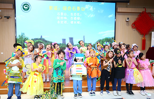 此外,九中教育集團所屬的首鋼幼教金頂街園等幼兒園的孩子們上演了精彩的“幼兒生態保護時裝秀”。他們身穿利用生活廢棄物品精心制作成各種造型的服裝,巧妙傳遞出了“變廢為寶”的環保理念。歌謠表演《綠色石景山》也為孩子們上了一堂生動的爭做環保小衛士、友愛相伴小動物的課程。
