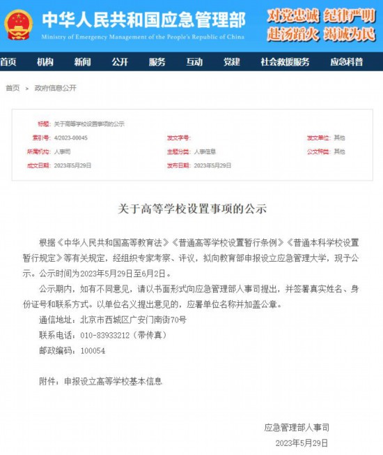 據應急管理部網站消息,29日,應急管理部人事司發布關于高等學校設置事項的公示。公示提出,根據《中華人民共和國高等教育法》《普通高等學校設置暫行條例》《普通本科學校設置暫行規定》等有關規定,經組織專家考察、評議,擬向教育部申報設立應急管理大學,現予公示。公示時間為2023年5月29日至6月2日。