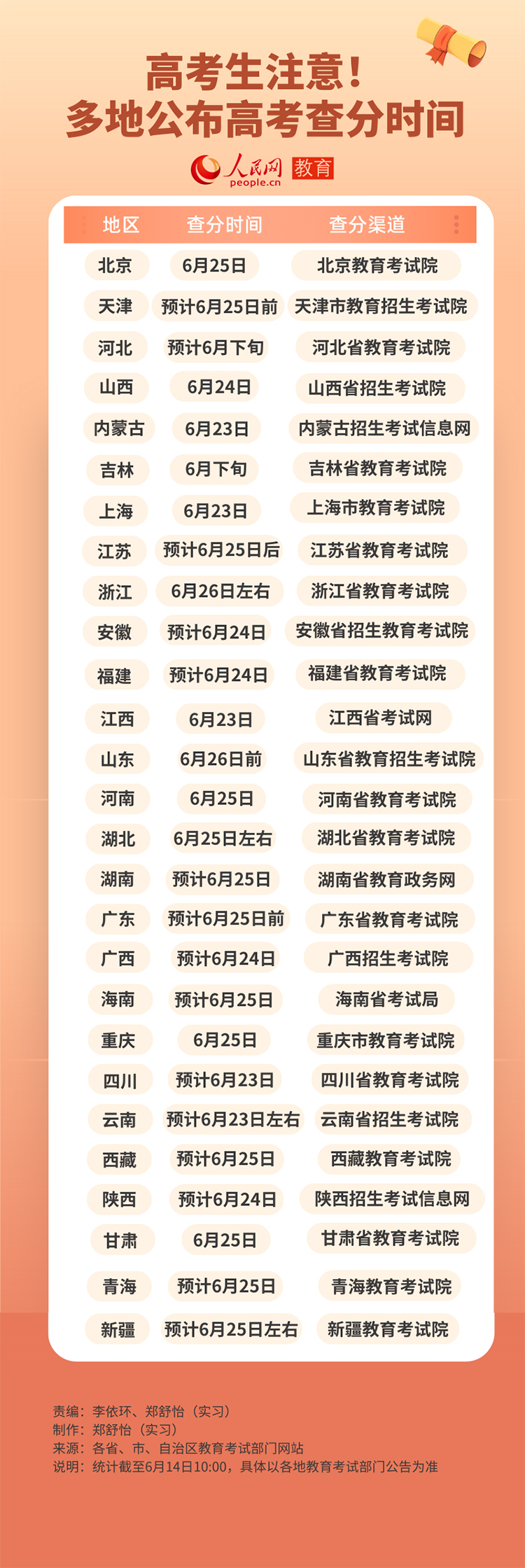 人民網北京6月14日電 2023年全國高考日前落下帷幕?荚嚱Y束后,高考成績何時可查?主要查分渠道是什么?人民網對目前已公布的查分時間及主要方式進行了梳理和匯總,以供廣大考生和家長參考。(李依環、實習生鄭舒怡)
