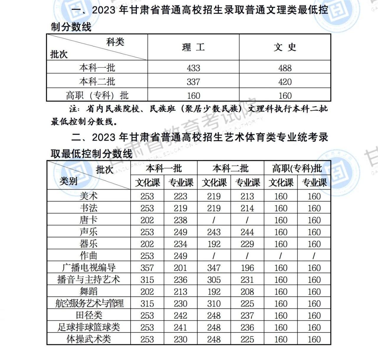 甘肅省2023年普通高校招生各批次各科類錄取最低控制分數線