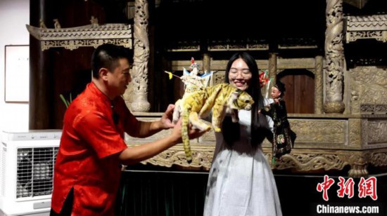 8月8日,陳怡蓁(右)體驗漳州非遺布袋木偶戲。漳州市文旅局供圖