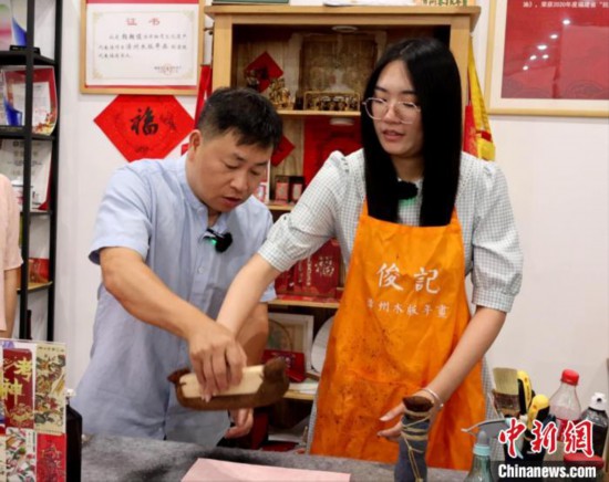 8月9日,陳怡蓁(右)體驗漳州非遺木版年畫。漳州市文旅局供圖