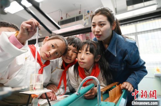 5月18日,四川阿壩州壤塘縣寄宿制學校學生在科學課做實驗!≈行律缬浾 安源 攝