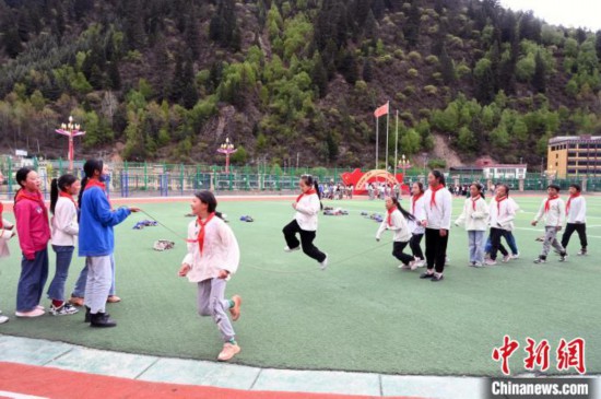 5月17日,四川阿壩州壤塘縣寄宿制學校的學生在操場跳繩!≈行律缬浾 安源 攝