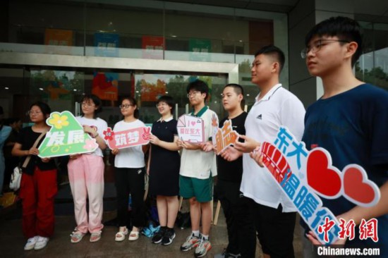 東南大學迎來4117名本科新生,在設立的綠色通道處,師生們合影。泱波 攝