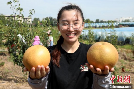 9月2日,潘雅潔展示剛采摘的梨子!£惣覙 攝