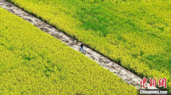 9月2日,潘雅潔在水稻種植基地查看水稻長勢!(無人機照片) 陳家樂 攝