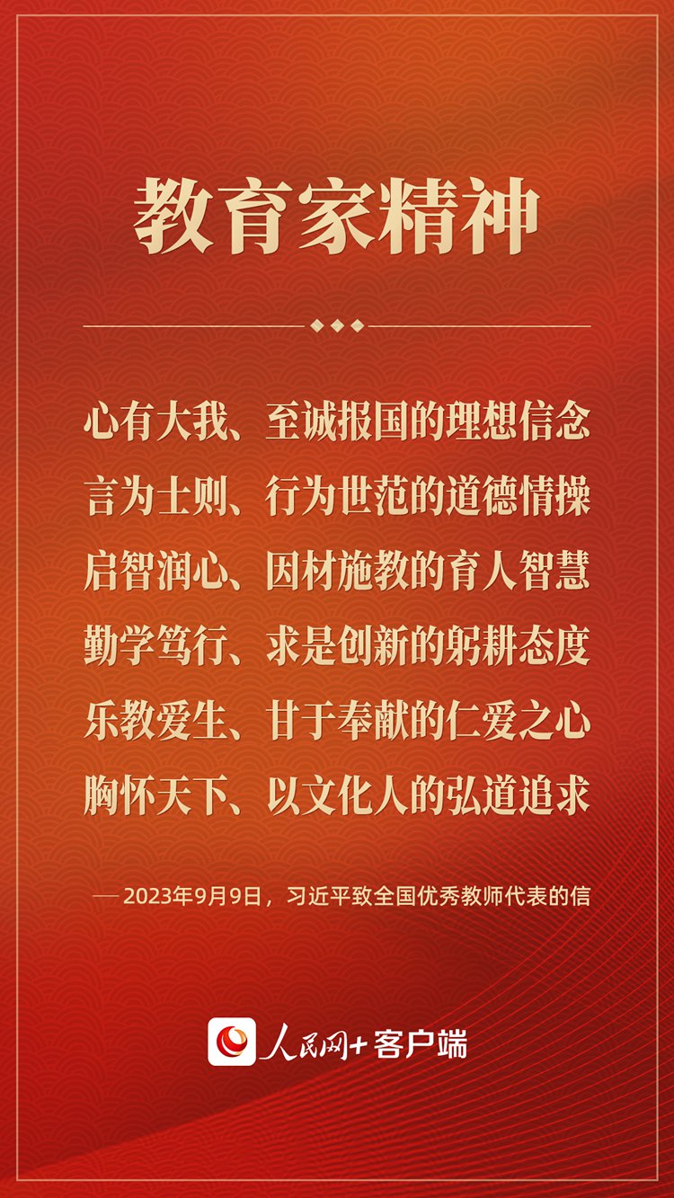 習近平在信中首次提出并深刻闡釋了中國特有的教育家精神的時代內涵,即“心有大我、至誠報國的理想信念,言為士則、行為世范的道德情操,啟智潤心、因材施教的育人智慧,勤學篤行、求是創新的躬耕態度,樂教愛生、甘于奉獻的仁愛之心,胸懷天下、以文化人的弘道追求”。
