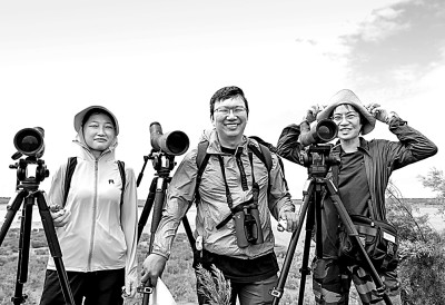 來自北京林業大學生態與自然保護學院東亞-澳大利西亞候鳥遷徙研究中心的賈亦飛(中)和他的團隊成員在鹽城黃海濕地工作。新華社發