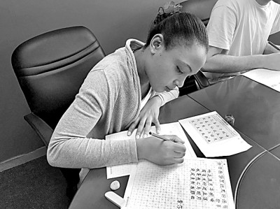 在南非德班理工大學孔子學院組織的漢字書寫大賽中,學員李莎正在書寫中國古典詩詞?鬃訉W院供圖