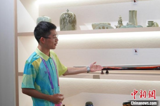 來自浙江外國語學院的“小青荷”王浩杰是媒體村文化屋的一名文化藝術助理,他主要負責向外國媒體記者介紹中國非遺文化,使其能夠充分感受中國文化的魅力。