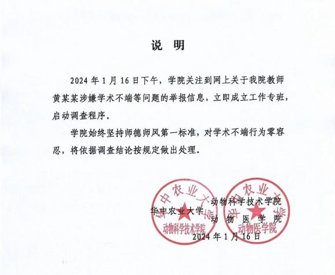 人民網北京1月17日電 (記者李依環)據華中農業大學消息,近日,有學生實名舉報該校某導師學術造假。16日晚,該校動物科學技術學院發布通報稱,學院關注到網上關于教師黃某某涉嫌學術不端等問題的舉報信息,立即成立工作專班,啟動調查程序。