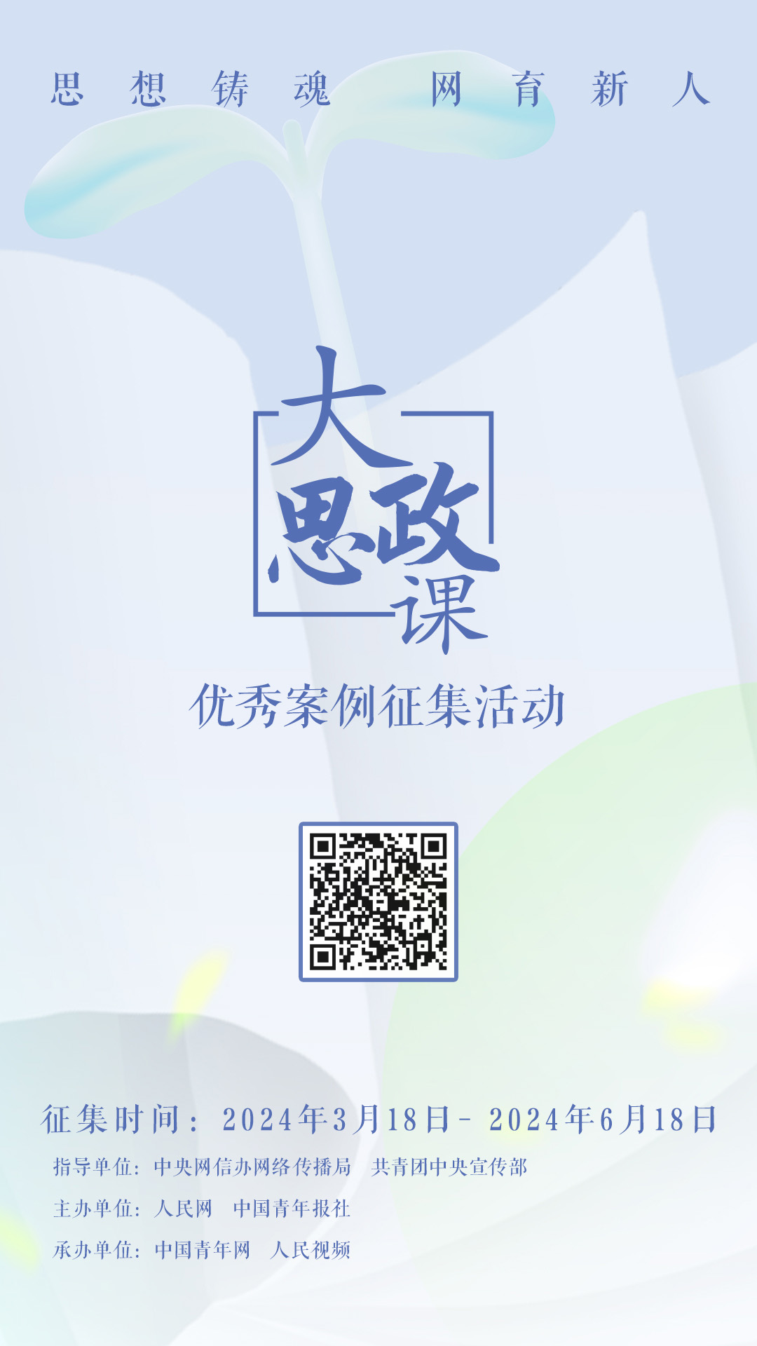 人民網北京3月18日電 (記者秦迪)3月18日,由中央網信辦網絡傳播局、共青團中央宣傳部指導,人民網、中國青年報社主辦的“思想鑄魂 網育新人”大思政課優秀案例征集活動正式啟動。