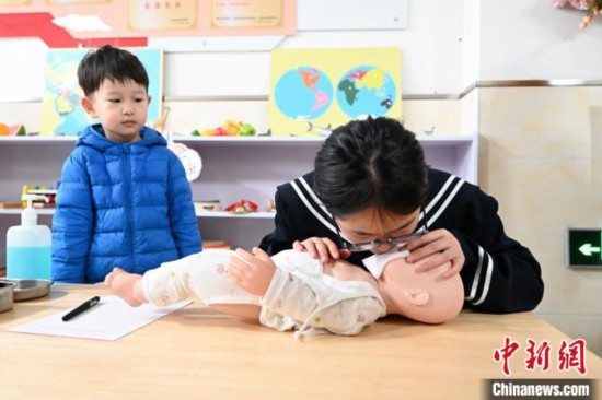 內蒙古呼和浩特市,幼兒保育專業學生展示嬰幼兒溺水急救。中新網記者 劉文華 攝
