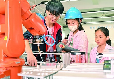 5月19日,2024年上海職業教育活動月正式啟動,通過“職業體驗”“優秀傳統文化進校園”等系列活動,展示上海職業教育改革的成果、經驗和貢獻,展現職教師生的風采,讓社會各界感受和體驗職業教育的精彩。圖為在上海市工業技術學校,小學生們體驗操作工業機器人。新華社記者 劉穎攝