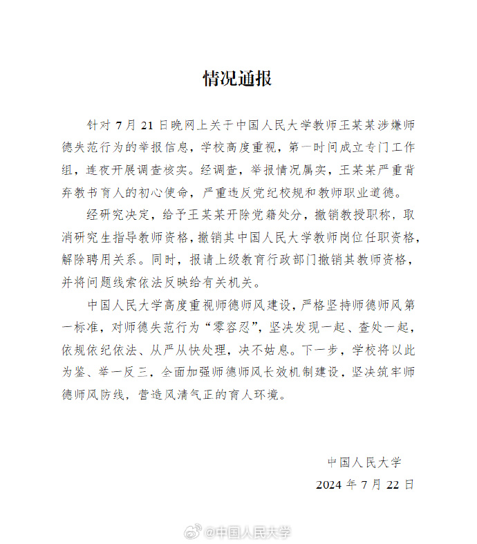 通報中稱,學校高度重視,第一時間成立專門工作組,連夜開展調查核實。經研究決定,給予王某某開除黨籍處分,撤銷教授職稱,取消研究生指導教師資格,撤銷其中國人民大學教師崗位任職資格,解除聘用關系。同時,報請上級教育行政部門撤銷其教師資格,并將問題線索依法反映給有關機關。