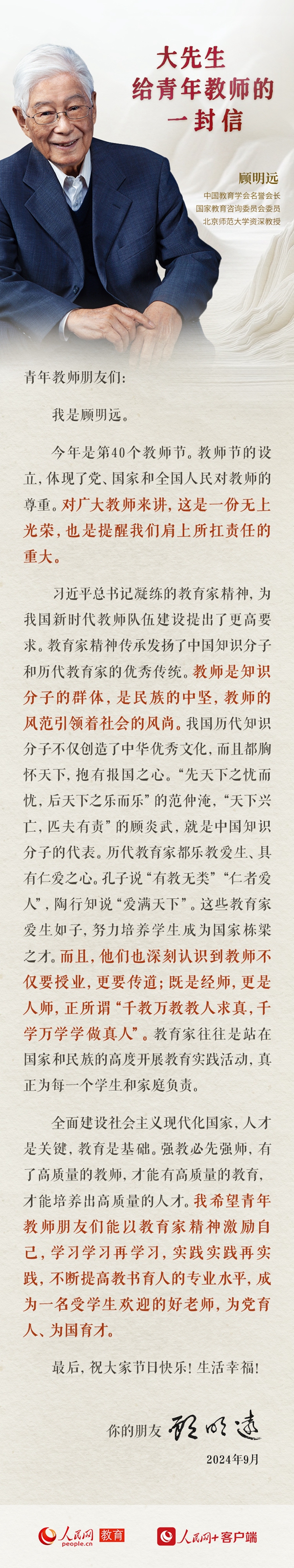 三尺講臺系國運,一生秉燭鑄民魂。今天是第40個教師節,人民網教育頻道邀請到中國教育學會名譽會長、北京師范大學資深教授顧明遠,給青年教師寫了一封信,給予大家奮進的力量。