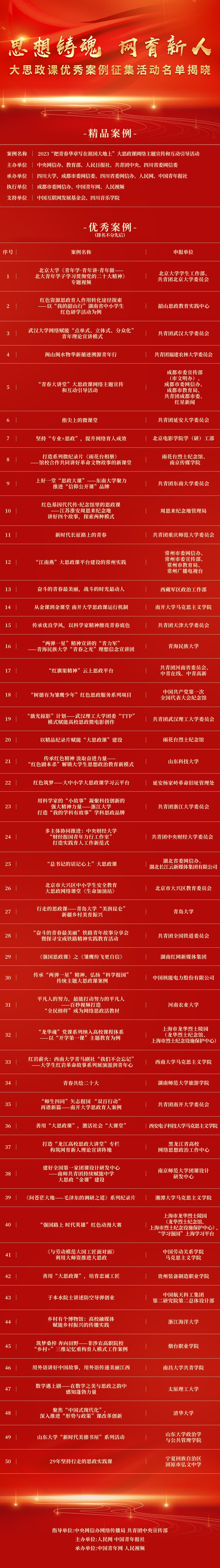 人民網北京2月10日電 (記者王鑫)由中央網信辦網絡傳播局、共青團中央宣傳部指導,人民網、中國青年報社共同主辦的“思想鑄魂 網育新人”大思政課優秀案例征集活動評選今天揭曉結果,經初選、終選以及結果公示,產生精品案例1件、優秀案例50件,名單如下: