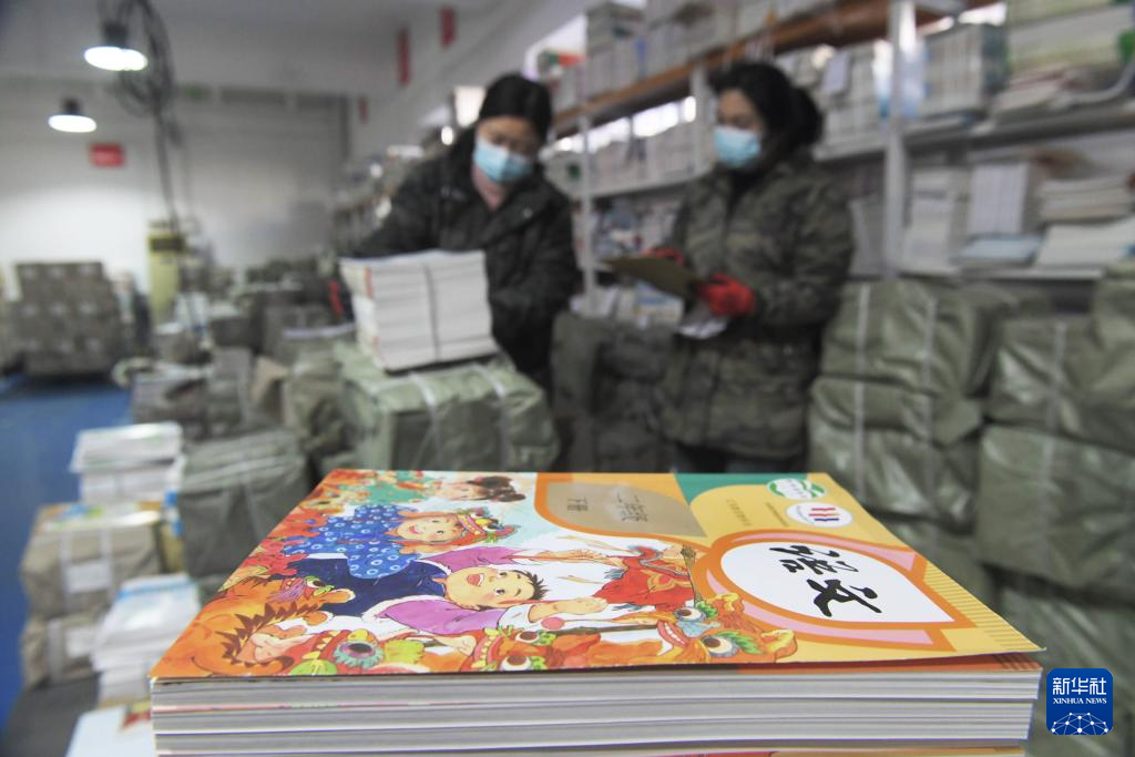 2月8日,工作人員在河北省石家莊新樂市新華書店倉庫整理清點中小學教材,準備送往各學校。