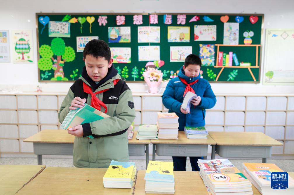 2月8日,江蘇省興化市景范學校的學生在清點、整理新學期教材。