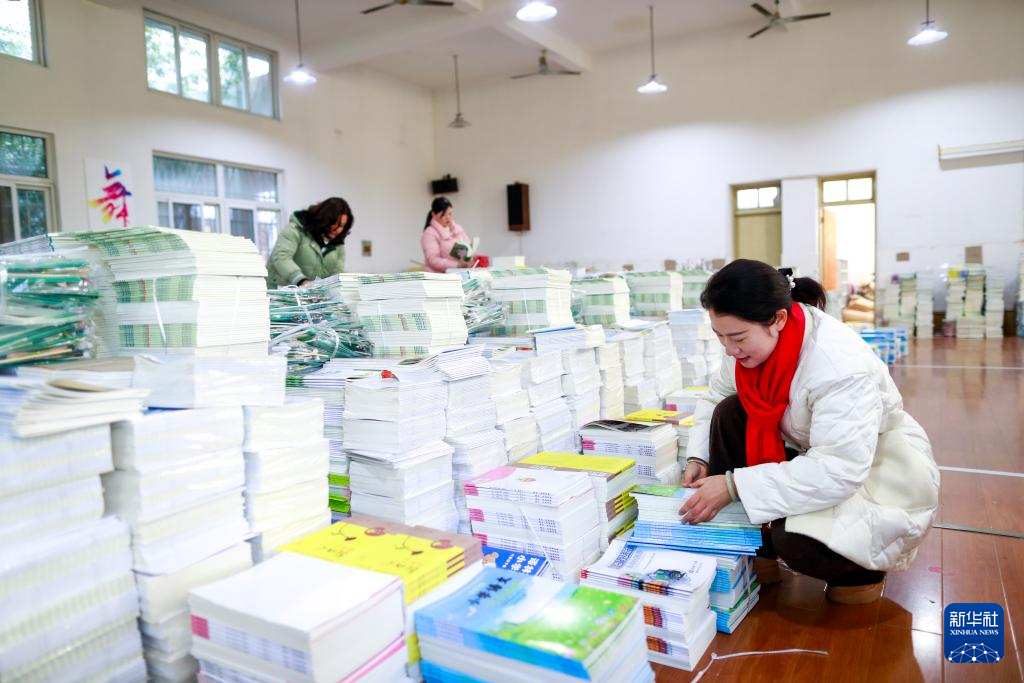 2月8日,江蘇省興化市景范學校的教師在整理、分發新學期教材。
