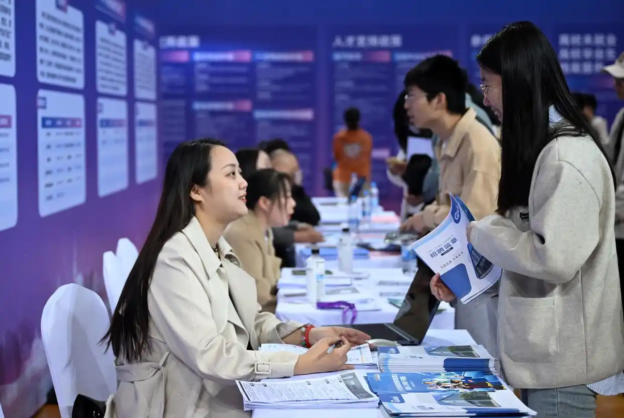 3月20日,環渤海城市聯合招聘高校畢業生春季專場活動在天津職業技術師范大學啟動,來自環渤海地區400多家企業提供崗位1.1萬個?;顒蝇F場還設立就業服務臺,為學生提供指導。圖為當日,求職學生(右)和招聘方代表在招聘會現場交談。新華社記者 趙子碩攝