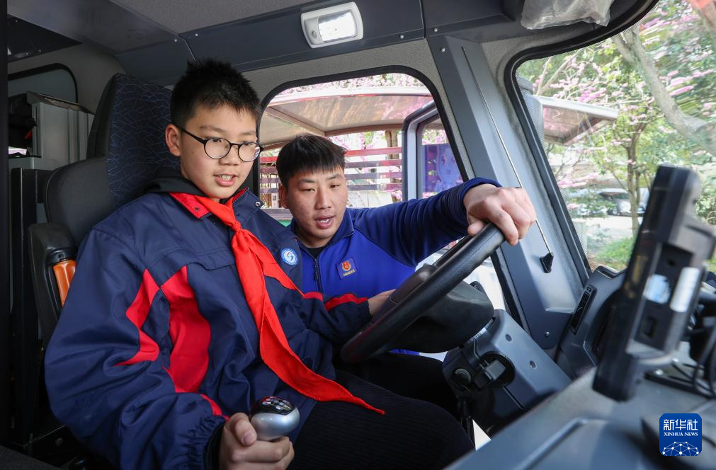 3月31日,浙江省湖州市吳興區埭溪鎮上強小學的學生在埭溪鎮消防綜合應急救援隊隊員的指導下了解消防車的構造。