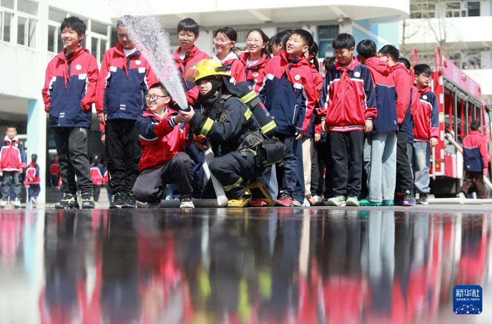 3月31日,在江蘇省揚州市邗江區美琪學校,學生在消防員指導下體驗使用消防水槍。