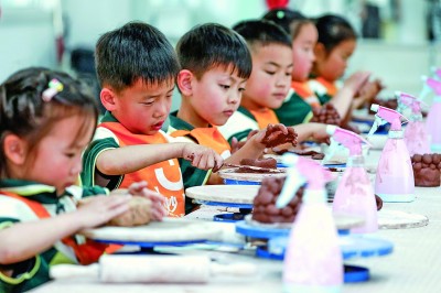 為迎接“五一”國際勞動節,江蘇省海安市高新區實驗幼兒園的孩子積極參與木工、泥塑、編織等手工勞動,體驗勞動的魅力。圖為4月29日,小朋友在體驗做泥塑。新華社發