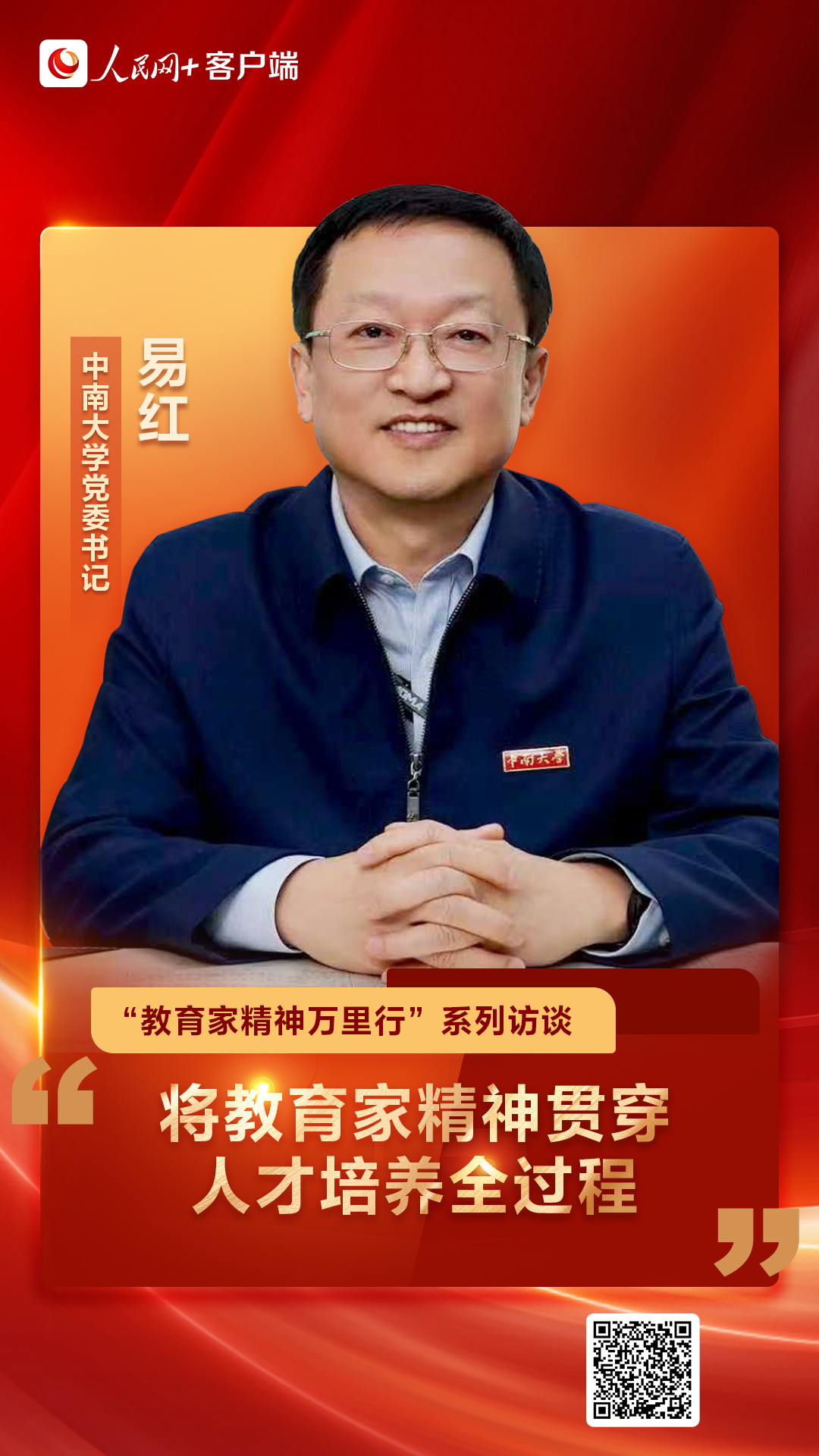 “強國必先強教,強教必先強師。中南大學立足建設中國特色世界一流大學的時代使命,將培育弘揚教育家精神貫穿人才培養全過程、教師發展各環節、科技創新各領域,不斷激發教師躬耕教育事業、服務強國建設的澎湃動力?!苯?,中南大學黨委書記易紅在接受人民網專訪時說。
