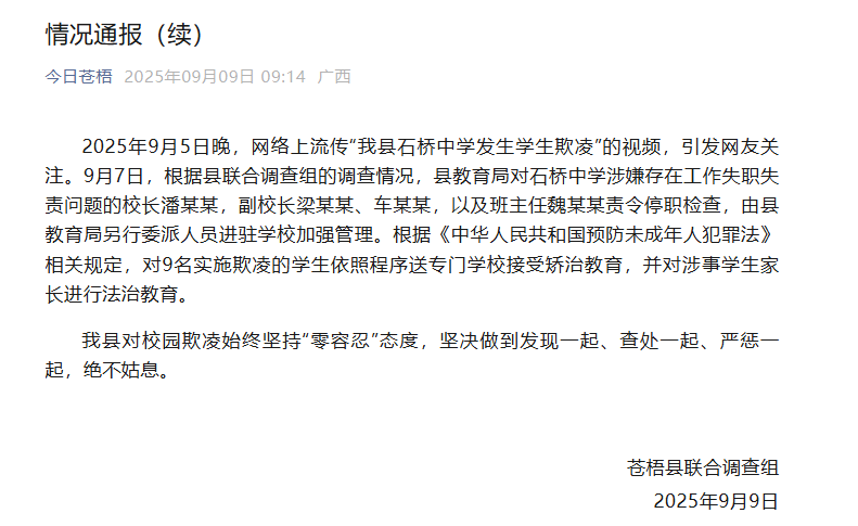 人民網北京9月9日電 (記者孫競)對于日前在網絡上流傳的“蒼梧縣石橋中學發生學生欺凌”的視頻,廣西梧州市蒼梧縣聯合調查組今天再次發布情況通報,對校長潘某某等多人責令停職檢查,9名實施欺凌的學生接受矯治教育。